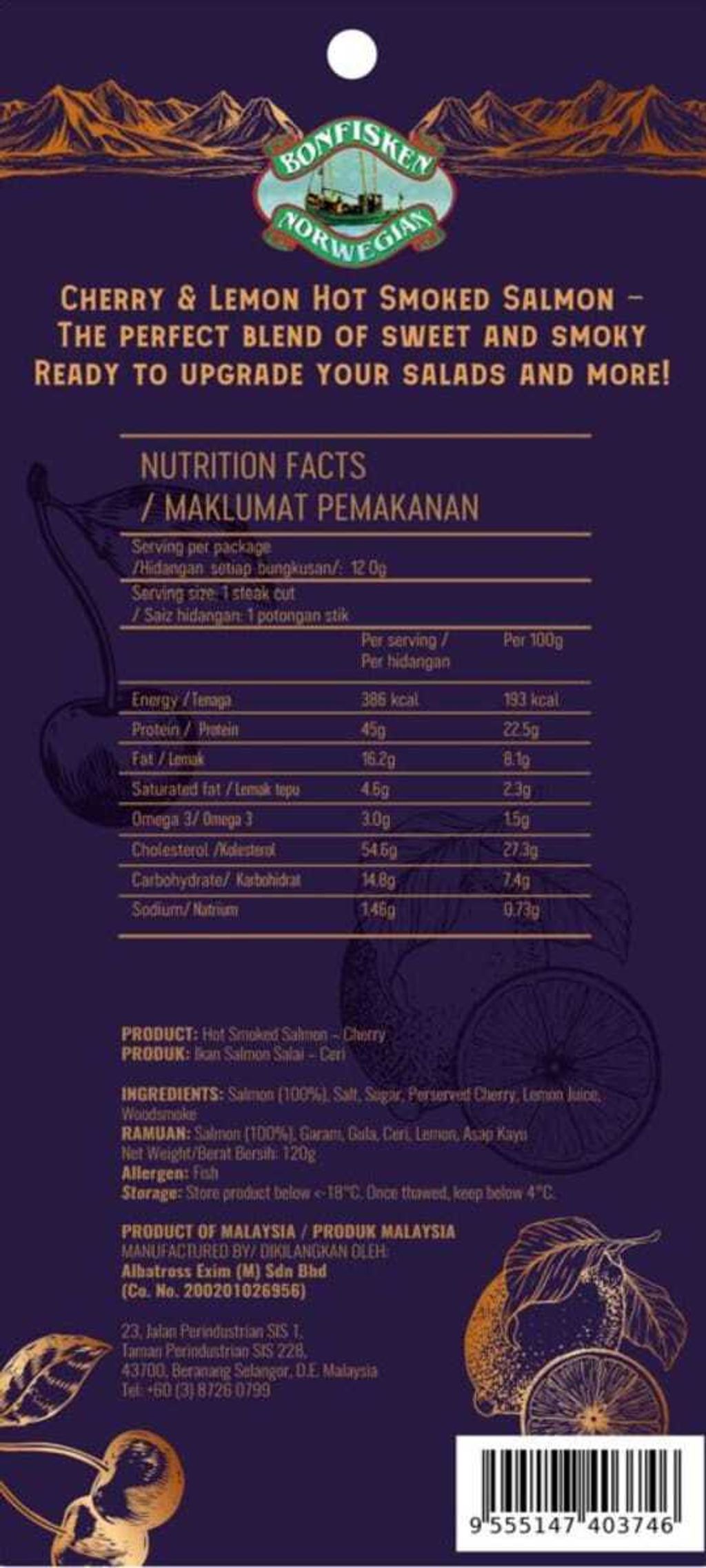 Salmon (100%), Salt, Sugar, Preserved Cherry, Lemon Juice